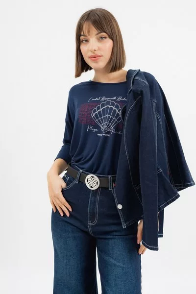 3/4-es ujjú női póló lezser fazon - nyomott mintával és strasszokkal vagy fém címkékkel díszítve<br> <br><p>Ez a <strong>3/4-es ujjú női póló</strong> <strong>lezser fazonú</strong>, amely kényelmes, könnyed viseletet biztosít a mindennapokra. A modellt stílusos <strong>nyomott minta és csillogó strasszok, illetve visszafogott fémcímkék</strong> díszítik.</p>