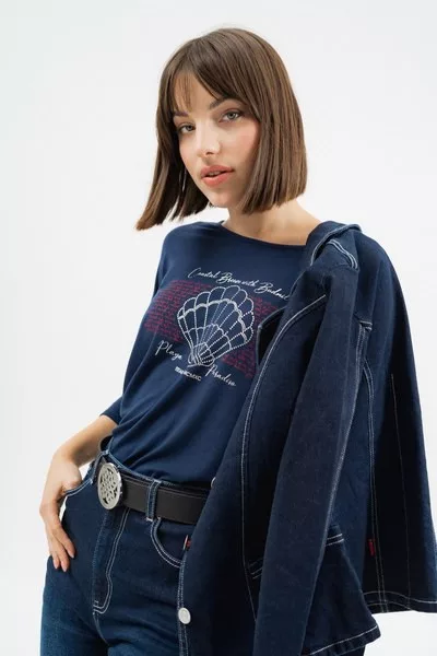 3/4-es ujjú női póló lezser fazon - nyomott mintával és strasszokkal vagy fém címkékkel díszítve<br> <br><p>Ez a <strong>3/4-es ujjú női póló</strong> <strong>lezser fazonú</strong>, amely kényelmes, könnyed viseletet biztosít a mindennapokra. A modellt stílusos <strong>nyomott minta és csillogó strasszok, illetve visszafogott fémcímkék</strong> díszítik.</p>