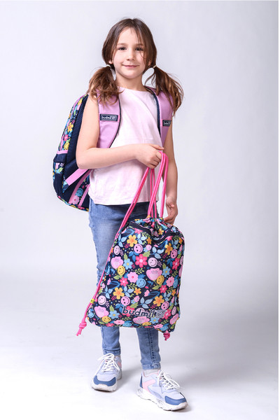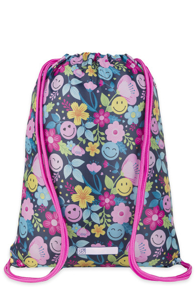 35x46 cm. Egyrekeszes tornazsák. Elején nagy cipzáros zsebbel. Alapanyaga vízlepergető. Virágos mintával.