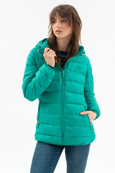 Női steppelt vékony dzseki .Enyhén karcsúsított fazon.Kapucni lecipzározható.Belső zsebek.Gumicímkékkel díszítve.