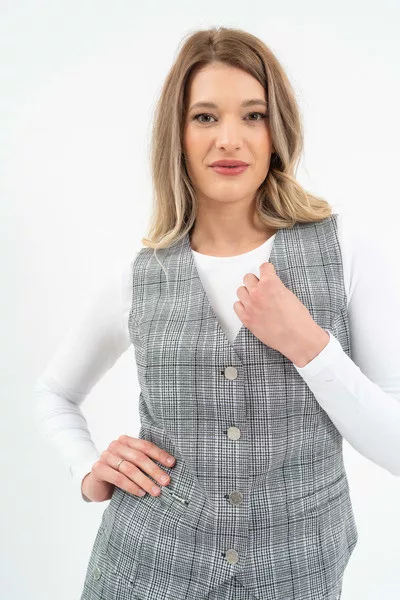 Női mellény. Karcsúsított fazon. Fémcímkével díszítve.