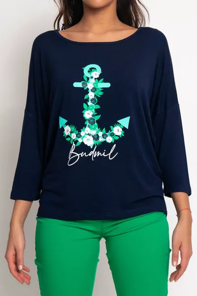 3/4-es ujjú női felső. Lezser fazon. Nyomott mintával díszített.