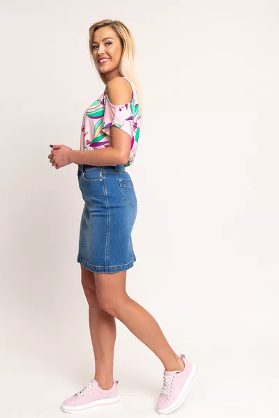 Női póló. Kivágott vállrésszel. Lezser fazon. Alja gumírozott. Nyomott mintával díszített.