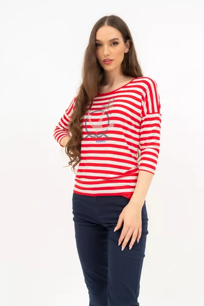 3/4-es ujjú női póló . Lezser fazon . Nyomott mintával és strasszokkal vagy fémcímkével díszített.