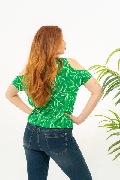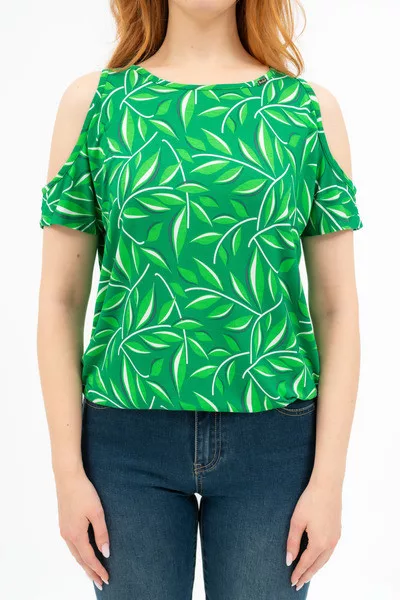 Női póló kivágott vállrésszel. Lezser fazon . Alja gumizott. Fémcímkével díszített.