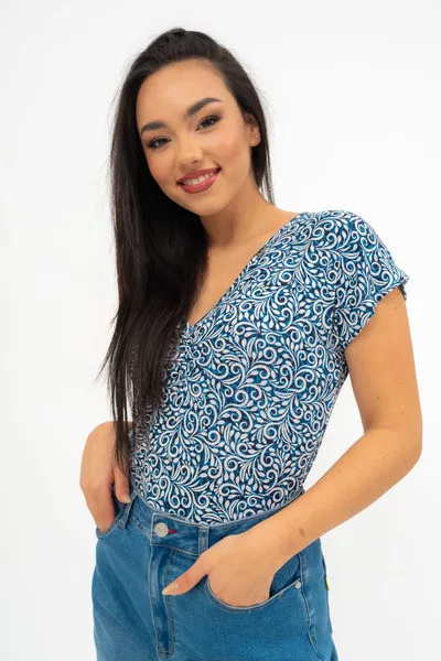 Női póló . Karcsúsított fazon . Húzott mellrésszel . Fémcímkévell díszített.