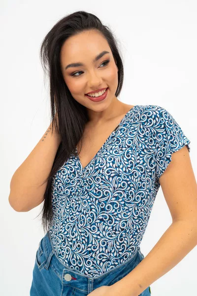 Női póló . Karcsúsított fazon . Húzott mellrésszel . Fémcímkévell díszített.
