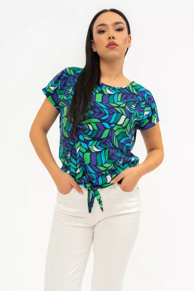 Női póló . Lezser, derékban megköthető fazon . Fémcímkével díszített.