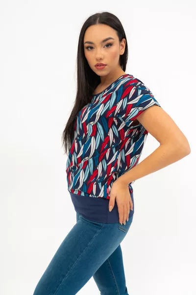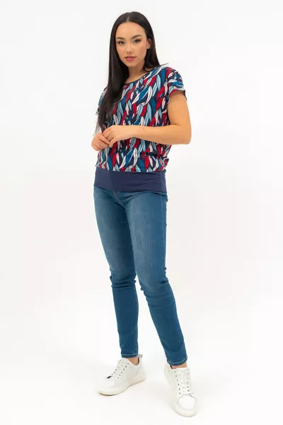 Női póló . Lezser fazon . Alján széles rugalmas pánt. Fémcímkével díszített.