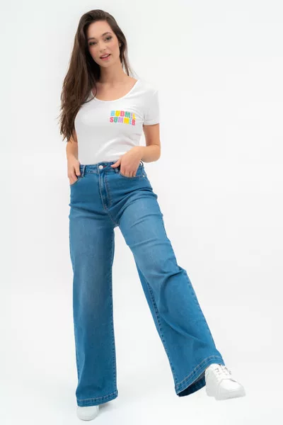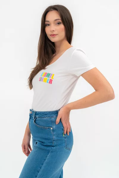 Női póló . Karcsúsított fazon . Nyomott mintával díszített.