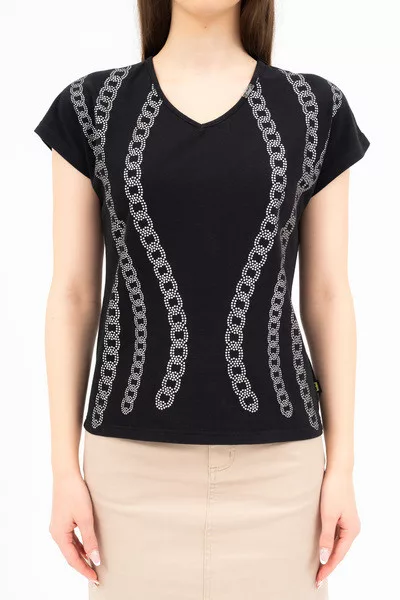 Női póló . Enyhén karcsúsított fazon . Nyomott mintával díszített.