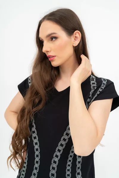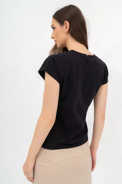Női póló . Enyhén karcsúsított fazon . Nyomott mintával díszített.