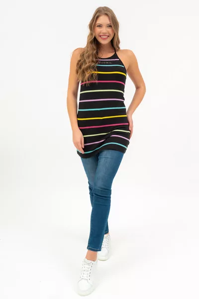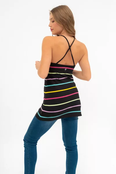 Női hosszított fazonú pántos felső. Karcsúsított fazon. Nyomott mintával díszített.