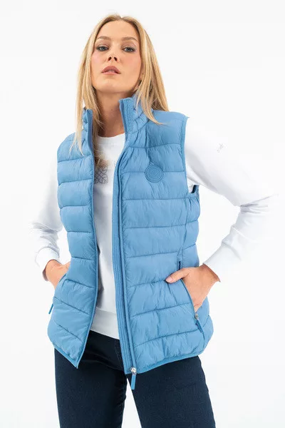 Női steppelt vékony mellény. Enyhén karcsúsított fazon. Belső zsebek. Gumicímkékkel díszítve.