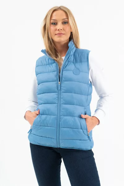 Női steppelt vékony mellény. Enyhén karcsúsított fazon. Belső zsebek. Gumicímkékkel díszítve.