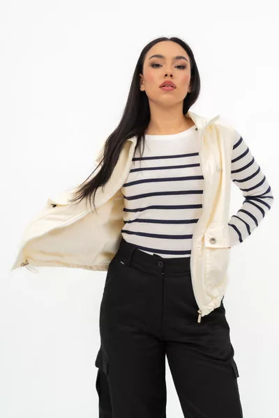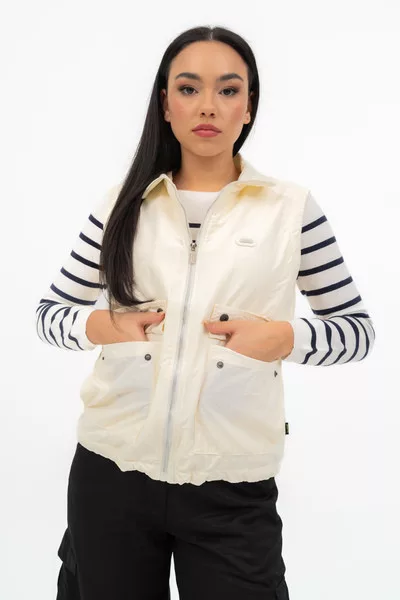 Női rövid fazonú vékony mellény. Polár anyaggal bélelve. Fémcímkével díszítve.