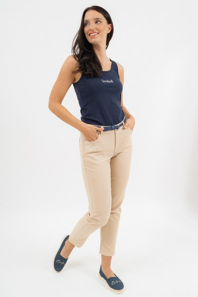 női hosszúnadrág szövött anyagból push-up fazon - derekán keskeny fonott övvel - fémcímkével vagy hímzéssel díszítve<br> <br><p>