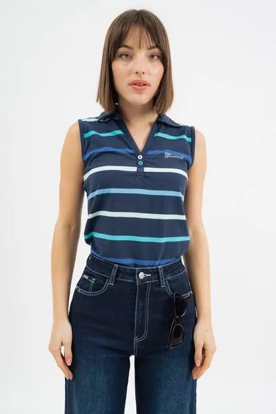 ujjatlan női galléros felsőszűk fazon - nyomott mintával díszítve<br> <br><p>Ez az <strong>ujjatlan női galléros felső</strong> <strong>szűk fazonú</strong>, amely kiemeli a nőies vonalakat és kényelmes, testhez simuló viseletet biztosít. A modellt stílusos <strong>nyomott minta</strong> díszíti.</p>