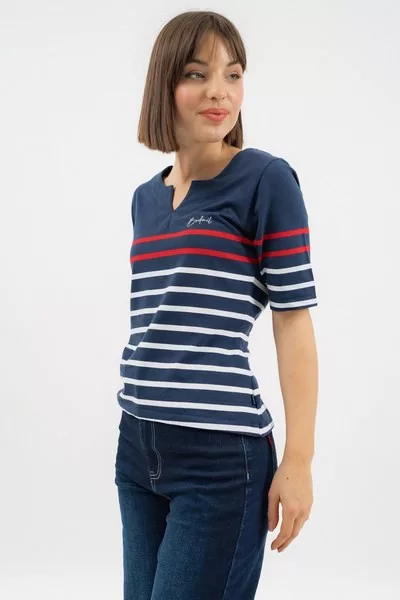 női póló karcsúsított fazon - nyomott mintával díszítve<br> <br><p>Ez a <strong>női póló</strong> <strong>karcsúsított fazonú</strong>, amely kiemeli a nőies vonalakat és kényelmes viseletet biztosít egész napra. A felsőt stílusos <strong>nyomott minta</strong> díszíti.</p>