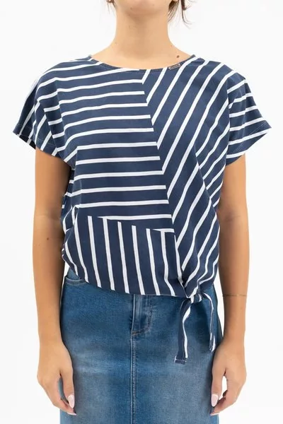 női póló lezser, derékban megköthető fazon - fémcímkékkel díszítve<br> <br><p>Ez a <strong>női póló</strong> <strong>lezser, derékban megköthető fazonú</strong>, amely kényelmes, mégis formás megjelenést biztosít. A derékrész pánttal állítható, így a póló viselése egyénre szabható, miközben nőies sziluettet ad. A modellt letisztult <strong>fémcímkés díszítés</strong> egészíti ki, amely elegáns apró részletként emeli ki a stílust.</p>