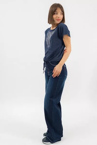 női póló lezser fazon - derekán megköthető - strasszokkal díszítve<br> <br><p>Ez a <strong>női póló</strong> <strong>lezser fazonú</strong>, amely kényelmes, könnyed viseletet biztosít. A <strong>deréknál megköthető kialakítás</strong> lehetővé teszi, hogy a pólót egyénre szabva viselje, miközben nőies sziluettet ad. A modellt csillogó <strong>strasszok</strong> díszítik.</p>