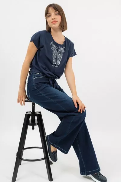 női póló lezser fazon - derekán megköthető - strasszokkal díszítve<br> <br><p>Ez a <strong>női póló</strong> <strong>lezser fazonú</strong>, amely kényelmes, könnyed viseletet biztosít. A <strong>deréknál megköthető kialakítás</strong> lehetővé teszi, hogy a pólót egyénre szabva viselje, miközben nőies sziluettet ad. A modellt csillogó <strong>strasszok</strong> díszítik.</p>