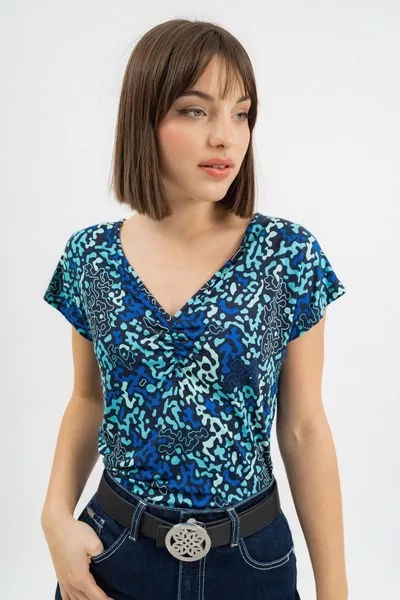 női póló karcsúsított fazon - húzott mellrésszel - fémcímkékkel díszítve<br> <br><p>Ez a <strong>női póló</strong> <strong>karcsúsított fazonú</strong>, amely kiemeli a nőies vonalakat és kényelmes, testhez simuló viseletet biztosít. A <strong>húzott mellrész</strong> finoman formázza az alakot, miközben stílusos részletet ad a ruhadarabnak. A pólót visszafogott <strong>fémcímkével díszítették</strong>.</p>
