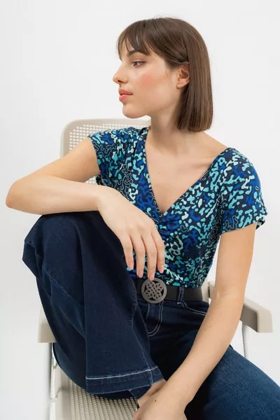 női póló karcsúsított fazon - húzott mellrésszel - fémcímkékkel díszítve<br> <br><p>Ez a <strong>női póló</strong> <strong>karcsúsított fazonú</strong>, amely kiemeli a nőies vonalakat és kényelmes, testhez simuló viseletet biztosít. A <strong>húzott mellrész</strong> finoman formázza az alakot, miközben stílusos részletet ad a ruhadarabnak. A pólót visszafogott <strong>fémcímkével díszítették</strong>.</p>
