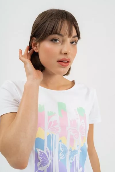 női pólókarcsúsított fazon - nyomott mintával díszítve<br> <br><p>Ez a <strong>női póló</strong> <strong>karcsúsított fazonú</strong>, amely nőies vonalakat hangsúlyoz, miközben kényelmes viseletet biztosít egész napra. A modellt stílusos <strong>nyomott minta díszíti</strong>.</p>