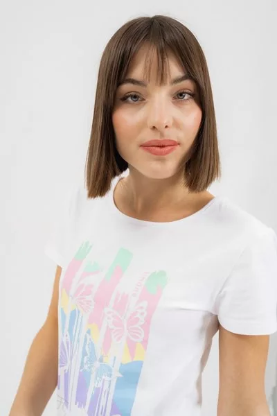 női pólókarcsúsított fazon - nyomott mintával díszítve<br> <br><p>Ez a <strong>női póló</strong> <strong>karcsúsított fazonú</strong>, amely nőies vonalakat hangsúlyoz, miközben kényelmes viseletet biztosít egész napra. A modellt stílusos <strong>nyomott minta díszíti</strong>.</p>