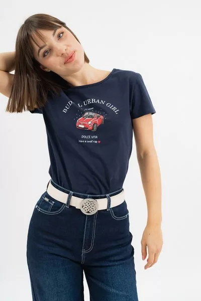 női pólókarcsúsított fazon - nyomott mintával díszítve<br> <br><p>Ez a <strong>női póló</strong> <strong>karcsúsított fazonú</strong>, amely nőies vonalakat hangsúlyoz, miközben kényelmes viseletet biztosít egész napra. A modellt stílusos <strong>nyomott minta díszíti</strong>.</p>