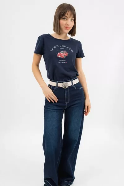 női pólókarcsúsított fazon - nyomott mintával díszítve<br> <br><p>Ez a <strong>női póló</strong> <strong>karcsúsított fazonú</strong>, amely nőies vonalakat hangsúlyoz, miközben kényelmes viseletet biztosít egész napra. A modellt stílusos <strong>nyomott minta díszíti</strong>.</p>