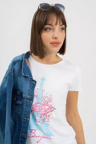 női pólókarcsúsított fazon - nyomott mintával és strasszokkal díszítve<br> <br><p>Ez a <strong>női póló</strong> <strong>karcsúsított fazonú</strong>, amely kiemeli a nőies vonalakat és kényelmes, testhez simuló viseletet biztosít. A modellt stílusos <strong>nyomott minta és csillogó strasszok</strong> díszítik..</p>