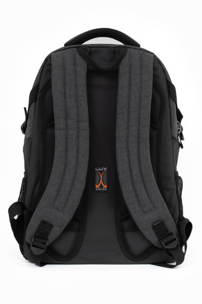 32x47x16 cm, 0,96 kg. Alapanyaga vízlepergető. Mindkét oldalán hálós kulacstartó zseb. Légcsatornás hátlap. Három különálló cipzáros rekesz. Az első rekeszben rendszerező zsebek. Laptoptartó: 26 X 38 cm.