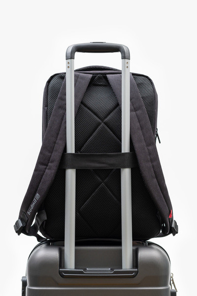 28x44x15 cm, 18L. Alapanyaga vízlepergető. Mindkét oldalán hálós kulacstartó zseb. Kettő különálló cipzáros rekesz. Elején kisebb cipzáros zsebek. A második rekeszben rendszerező zsebek. Laptop tartó. Bőröndre rögzíthető.